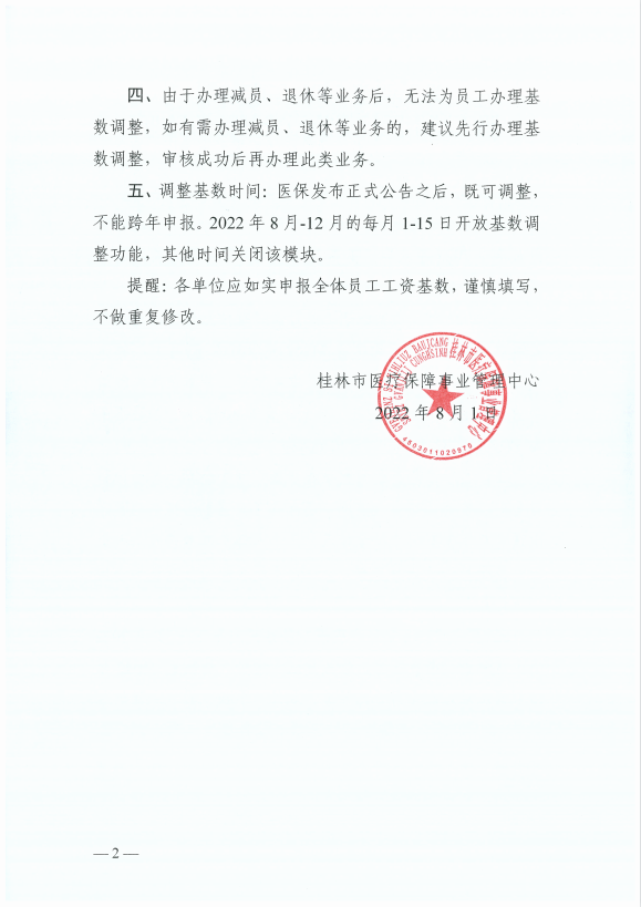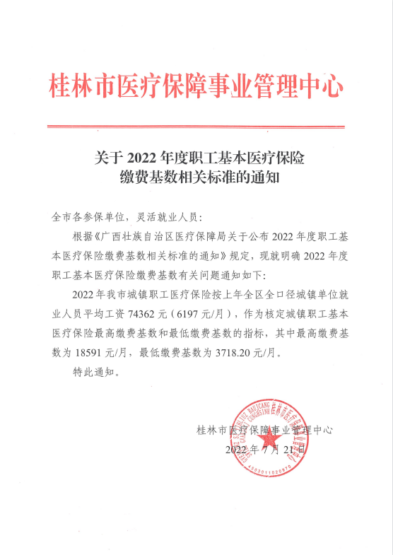 根据《广西壮族自治区医疗保障局关于2022年度职工基本医疗保险缴费基数上下限标准的公告》规定,现就调整用人单位2022年度职工基本医疗保险缴费基数有关问题说明如下: