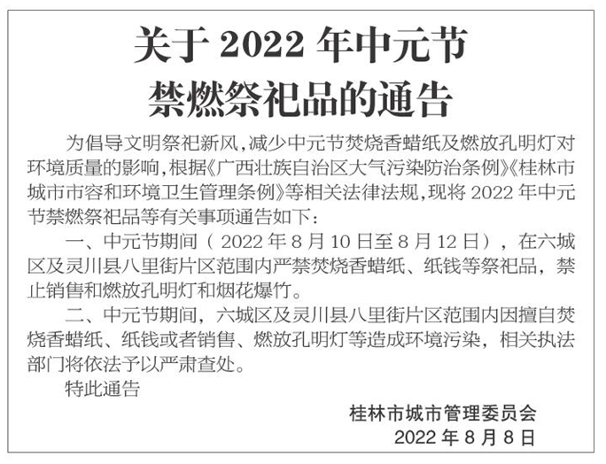 为倡导文明祭祀新风,减少中元节焚烧香蜡纸及燃放孔明灯对环境质量的影响,根据《广西壮族自治区大气污染防治条例》《桂林市城市市容和环境卫生管理条例》等相关法律法规,现将2022年中元节禁燃祭祀品等有关事项通告如下: