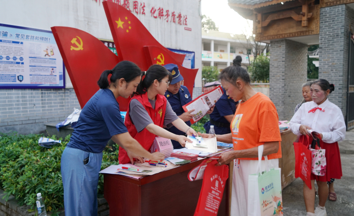 全国2021年度“平安之星”——李官村村辅(协)警陆增勇(中)在发放宣传资料 陆仕臣/摄