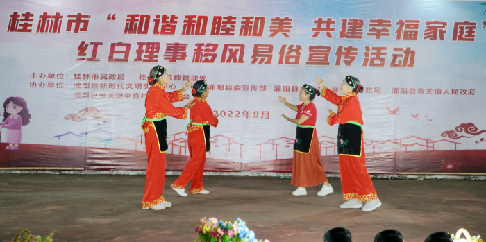 8月15日晚,由桂林市民政局、市殡葬管理处主办,灌阳县新时代文明实践中心、中共灌阳县委宣传部、灌阳县文明办、灌阳县民政局、灌阳县黄关镇人民政府会承办的“红白理事移风易俗”宣传活动在黄关镇李官村村委举办。