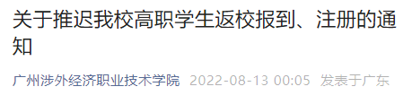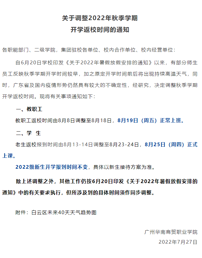 因新冠肺炎疫情近期有所反弹,防控形势依然严峻,据上级文件精神和学校实际情况,按照"分期分批、错时错峰"的返校原则,经学校研究决定,2022 级高职新生报到时间调整为 9 月 11 日;2020、2021 级学生开学返校时间调整为 9 月 3 日-4 日,5 日正式上课;教职员工返校时间不变。