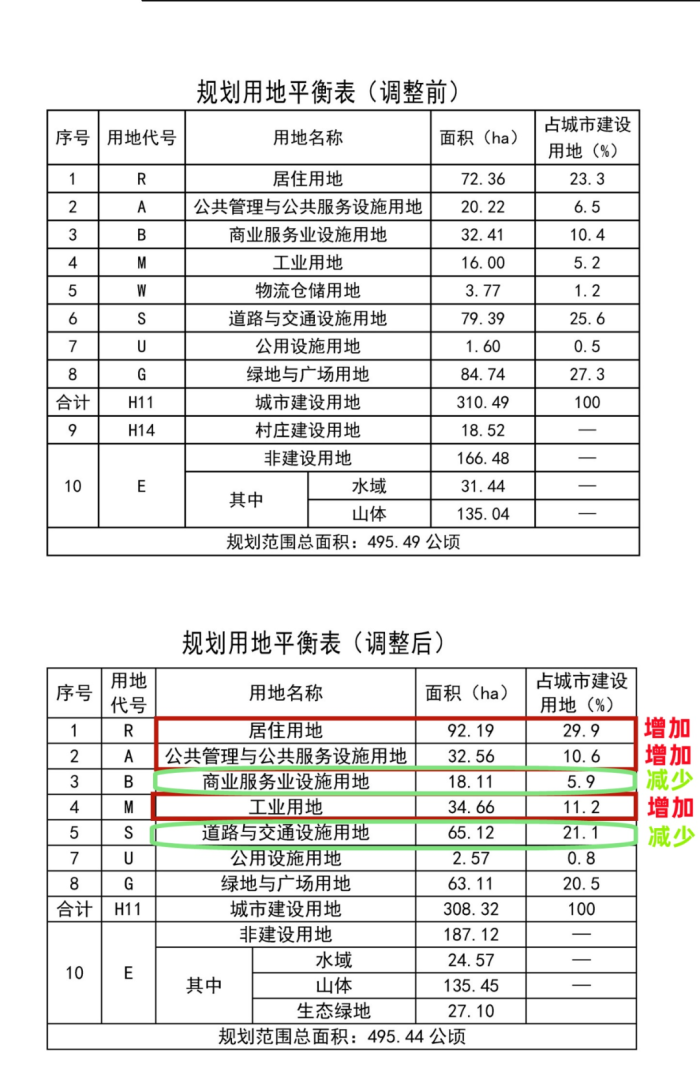 从整个控规调整的内容来看,增加了居住用地、公共管理与公共服务设施用地和工业用地的比例,缩减的主要是商业服务业设施用地、道路与交通设施用地。
