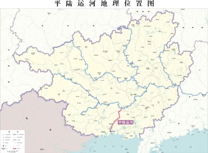 ●平陆运河始于南宁横州市西津库区平塘江口,经钦州灵山县陆屋镇沿钦江进入北部湾,平陆二字,取自广西南宁西江干流平塘江口和钦江干流入口钦州市陆屋镇。虽然如此命名,平陆运河其实除了平塘江口至陆屋镇,还包括经钦江干流南下进入北部湾钦州港海域全线共计约135公里的水运航道。其中分水岭越岭段开挖约6.5公里。