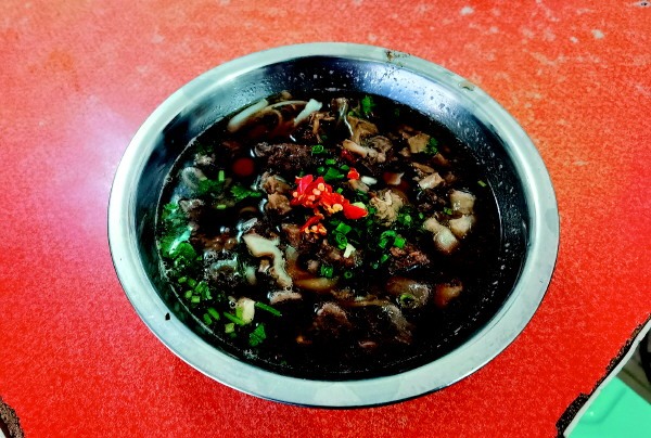 在等待采访的间隙,记者也要了一碗被周边居民们强烈推荐的牛菜粉。二两切粉,老板娘像盖浇饭一样打上几勺牛菜,加入满满一大勺的肉汤,最后撒上切好的葱花、香菜末,这碗散发着浓郁香气的牛菜粉着实令人食指大动。深棕色的牛腩汤底肉香十足,入口还带有浓郁的卤水鲜味;牛腩块用筷子一戳就能扎透,但是依旧保持着肥瘦相间的方块形状,毫不松散,已经炖透的牛筋入口软糯筋道,跟酥松多汁的牛腩形成鲜明对比。一碗粉吃下来,忍不住连汤也一同喝干净,满嘴都是炖牛腩的浓香回味。