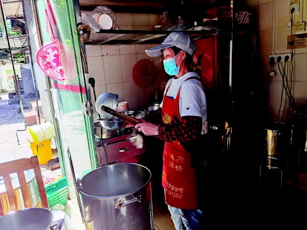 擦掉了灶台上的污渍,谢松青又拿起拖把开始弯腰拖地。“说实话,这么一直做牛菜粉挺累人的,开店的时候一直站在几口大锅中间,那股热气蒸得人也是满头大汗,夏天的时候没多久衣服就湿透了。”