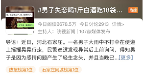1日,河北石家庄一男子失恋喝1斤白酒吃18袋头孢冲上微博热搜榜第一名这是怎么回事↓↓↓