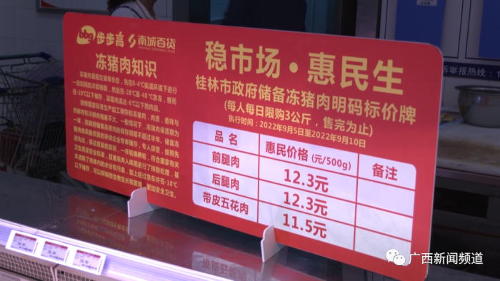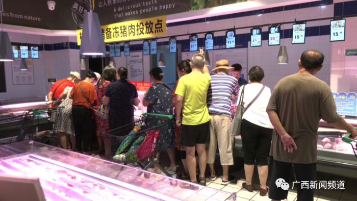 桂林市投放3.3万公斤政府储备冻猪肉“迎中秋”9月5日,桂林市正式开始向市场投放和销售政府储备冻猪肉,确保中秋节期间猪肉市场稳定。今天上午,记者在桂林市七星区南城百货桂林国展分店看到,政府储备冻猪肉一经投放,很快就被抢购一空。