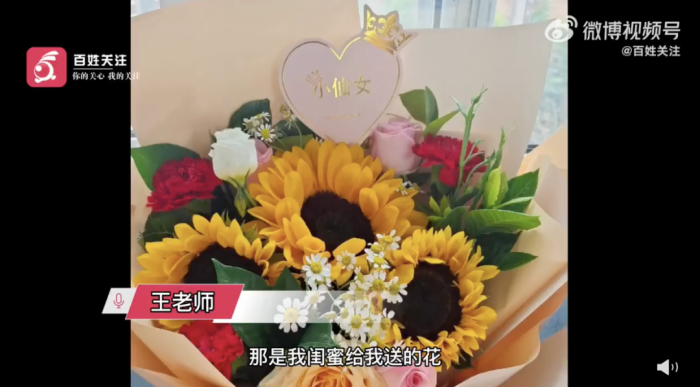 9月9日,网名“美丽裙子”的女老师拍摄所收礼物为一束鲜花、一盒月饼及一箱饮料,并配文“带上满满的爱回家过节!”“当老师的好处就是处处被偏爱着,感谢王某某妈妈送来的教师节礼物。”