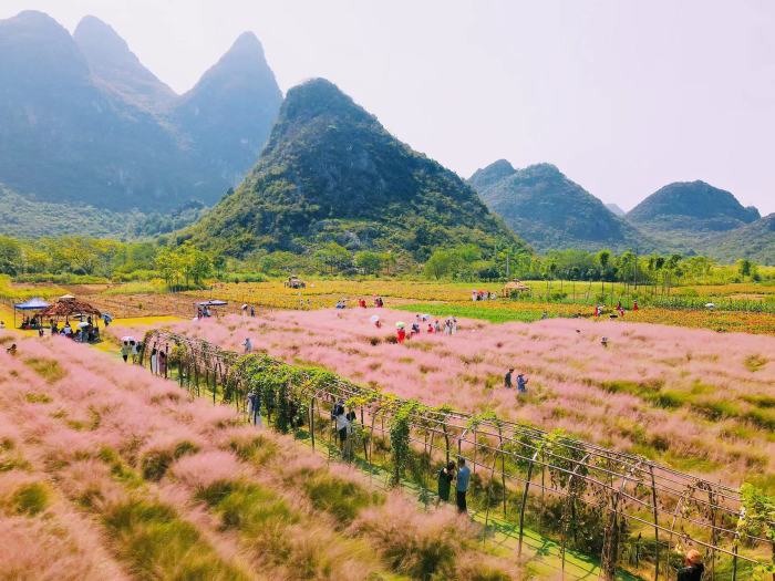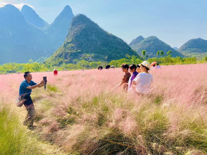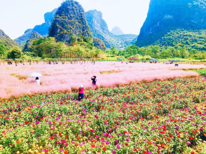 这片花海有个很美的名字,叫做“花田拾光”,位于桂林市七星区朝阳乡丫吉村委田心村,地处近郊,交通十分便利。这个花海是由10位平均年龄50岁的阿姨,下岗创业,经过一年时间的精心培育建成的,人称“花海十娘”。“花田拾光”花海已于9月8日正式开园,花海面积30余亩。据花海负责人骆玉萍介绍,今年,“花田拾光”花海细心培育了极具网红气质的粉黛乱子草,这是第一年全新栽种的新品,一大片粉黛草吸收土地的养分特别好,长得很茂盛。百日草和粉黛的花期都很长,大概有2个月左右,花海美景将持续到十月中旬。目前百日草已经处于盛花期,粉黛乱子草也开始泛红,到国庆假期,这里将成为一片超级震撼的“粉色”海洋。在未来,骆玉萍和她的姐妹们将带动村民一起发展种养产业和农家乐,让游客在游玩时还能品尝到美味的农家菜,让村民生活变得更加富裕。