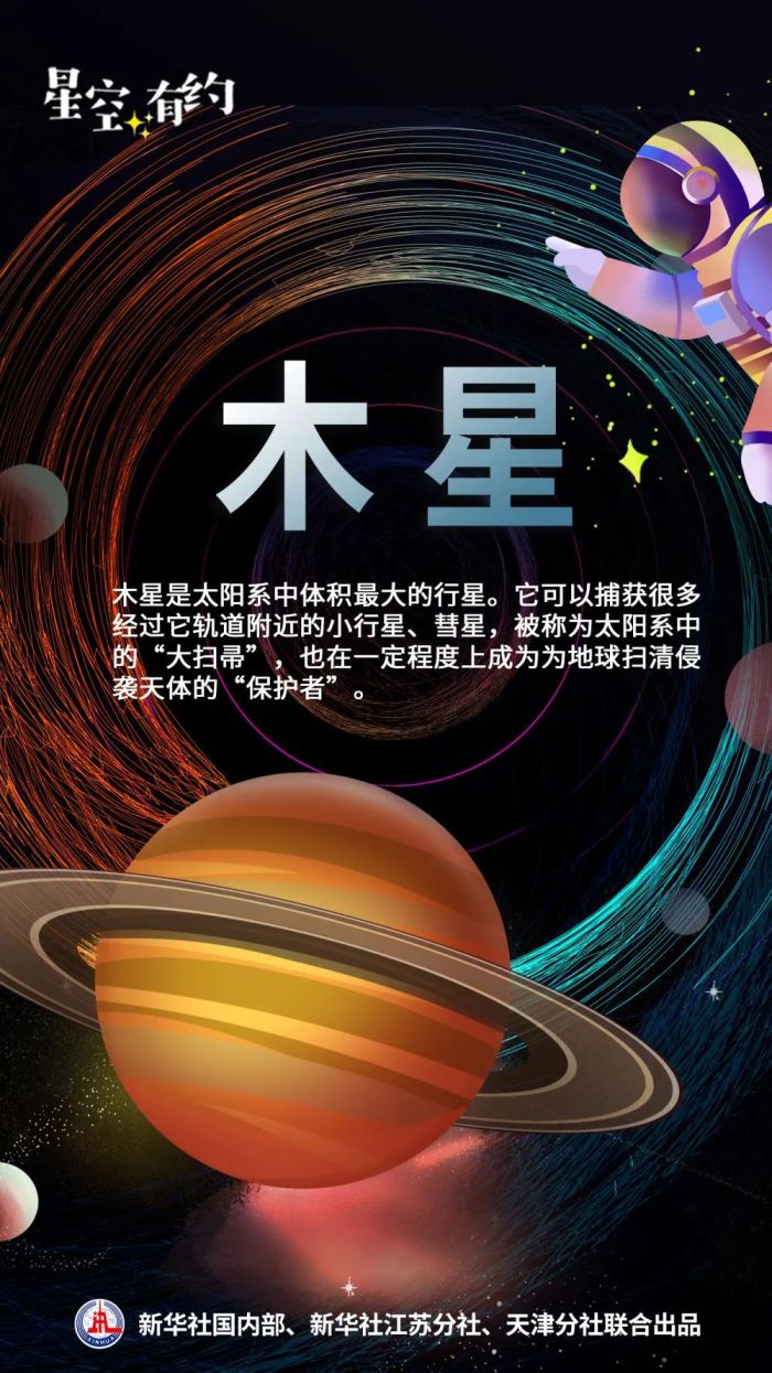 木星是距离太阳第五近的行星,也是太阳系中体积最大的行星。它的质量约是太阳系其他行星质量总和的2.5倍,这一巨大质量产生了强大的引力,使它可以捕获很多经过它轨道附近的小行星、彗星。木星因此被称为太阳系中的“大扫帚”,也在一定程度上成为为地球扫清侵袭天体的“保护者”。