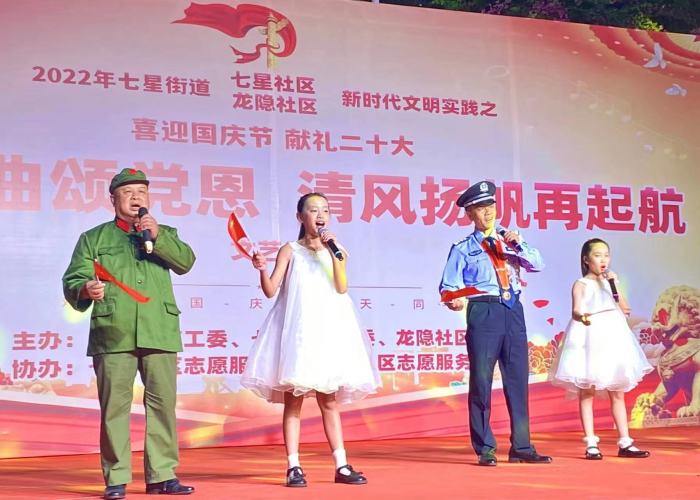 9月26日晚上,三金小广场围满了人,悠扬美妙的歌声从这里传了出来。这是桂林七星区七星街道工委、七星社区党委、龙隐社区党委联合开展“红歌廉曲颂党恩 清风扬帆再起航”文艺汇演活动,以舞台表演形式弘扬优秀传统文化、传播清廉之风,丰富社区居民的文化生活,增进邻里情谊。路过的群众也被演出吸引,纷纷驻足观看,居民群众欢聚一堂,开心喜迎国庆节,献礼二十大。