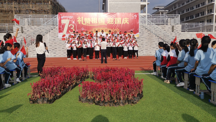 全体党员教师和音乐老师共唱《今天是你的生日,我的中国》,通过深情的歌声,表达对祖国母亲真挚的爱。全体师生手举小国旗,随着音乐节奏,左右挥动,嘹亮的歌声响彻操场。