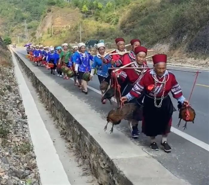 网传视频显示,一行人穿着红蓝色的民俗服装,戴着银色头饰,提着鸡鸭、水果等走在马路边,场面十分壮观。视频发布者在评论区回复道,“宝宝满月,回外公外婆家,舅舅舅妈给饭吃,才能健健康康平平安安长大。”不少网友纷纷表示羡慕,“好隆重,也太幸福了。”“祝福你们家人健康平安。”