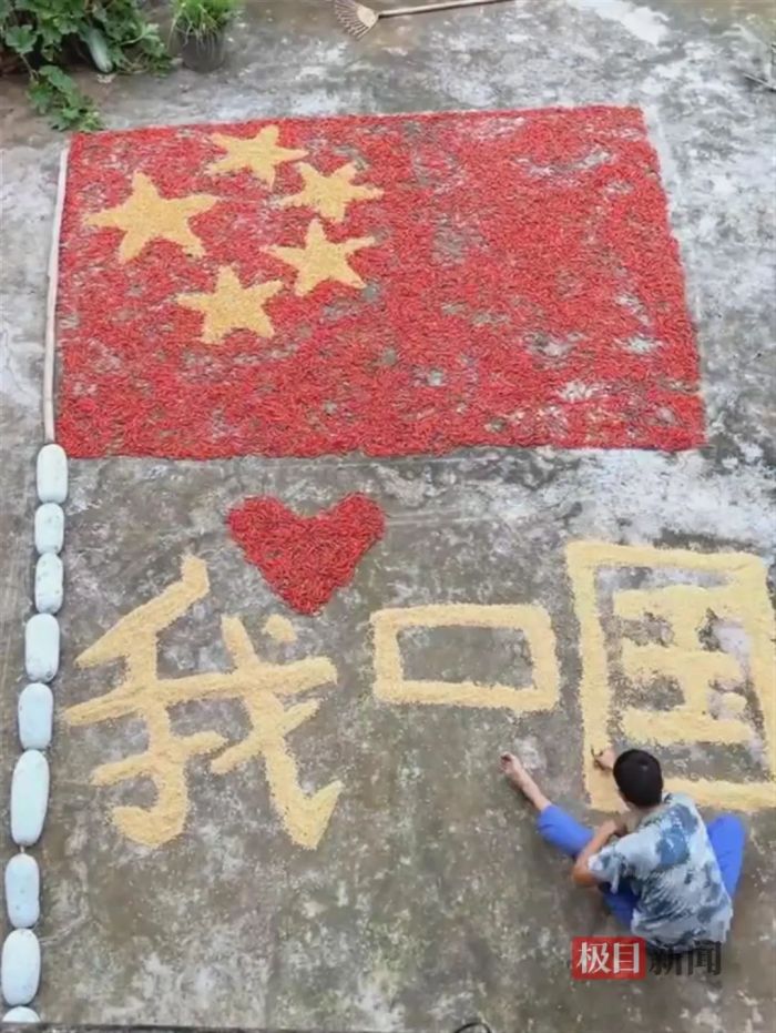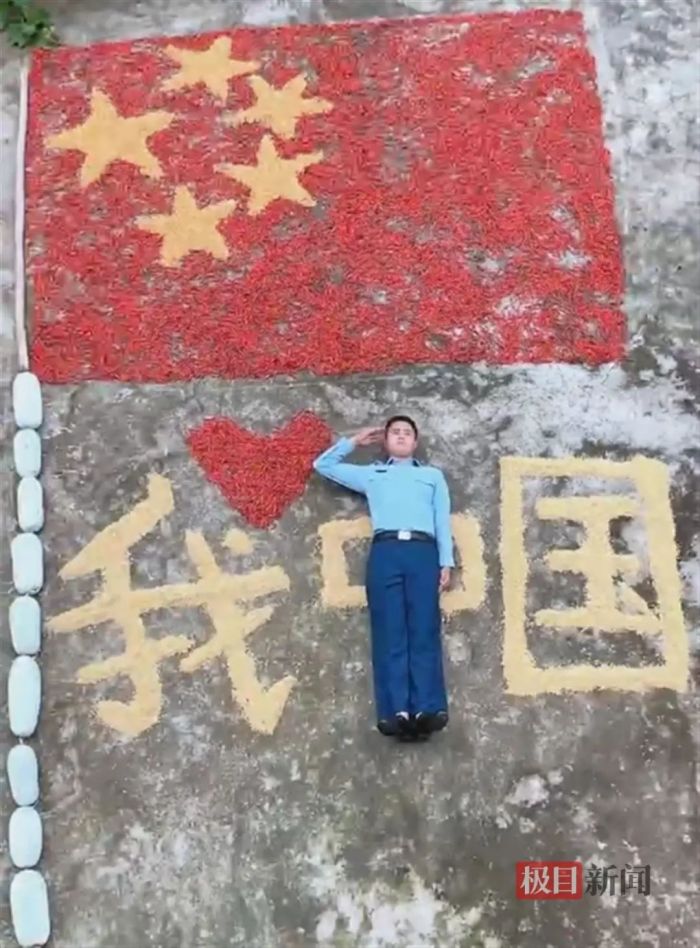 何咚咚告诉极目新闻记者,国庆节前,他就在思考用什么方式迎接国庆,“目前正值秋收季节,就用辣椒和粮食摆了一面国旗。同时,自己穿着军装躺下敬礼,与粮食一起拼出了‘我爱中国’的字样。”