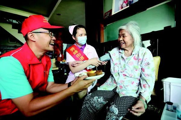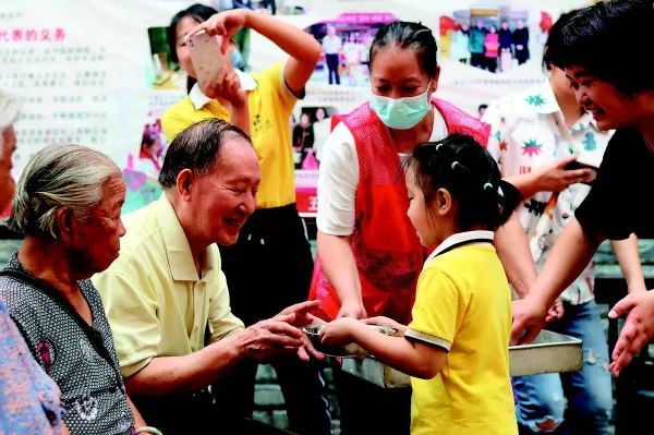 ▲在国庆、重阳节来临之际,七星区东江街道五通社区文化小广场上,百碗冒着热气的米粉香飘四方。来自东江小学的孩子与社区志愿者们一道,将米粉送到了社区老人的手上。82岁的老人谭政锋笑呵呵地接过米粉,握了握小朋友的手:“谢谢小朋友,你送来的米粉真香呀!这个重阳节真开心!”