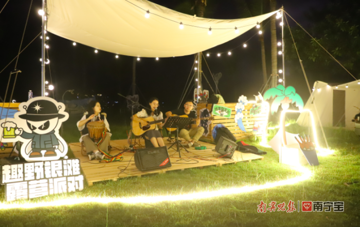 银滩景区露营派对(景区供图)在北海以露营野餐、海边烧烤、赶海拾贝等为主题的“近郊游”备受青睐。在廉州湾大道旁的草坪、空地上,每隔几米就有市民在草地上搭着帐篷、铺上垫子野餐和露营,其中多以亲子、家庭、朋友为单位开展活动。