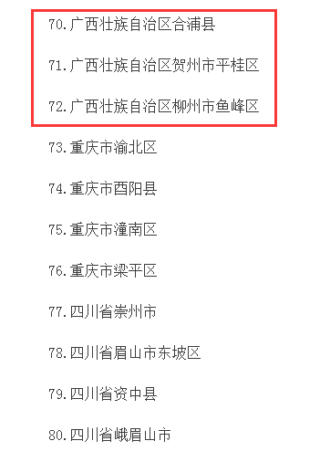 其中,广西合浦县贺州市平桂区柳州市鱼峰区入围!