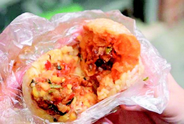 记者点了一份少辣的糯米饭,在手里稍微把它团紧实,一口咬下去,最先感受到的是米饭的软糯,然后是细腻的豆蓉,随着“咔哧”一声,牙齿咬到了夹在中间的脆片,在脆和糯的混合口感里,香肠的鲜甜和萝卜干的酸辣爽脆再增添了几分层次,让糯米饭的味道又上了一个台阶。