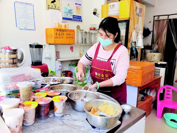 “我要一个4块钱的,不要辣椒。”一位骑着电动车的顾客把车停在门口向老板娘点单。身着围裙的老板娘麻利地给铁钵套上袋子,先用一勺米饭打底,再从左到右把柜台上的豆蓉、香肠碎、萝卜干、酸豆角等配料按顺序加入,最后再来一勺米饭“封顶”,不出半分钟,一个拳头大小的糯米饭就送到了顾客手里。