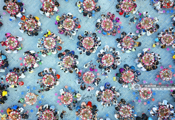 广西不断促进各民族交往交流交融,形成了各民族和睦相处、和衷共济、和谐发展的生动局面。图为鹿寨县中渡古镇各族群众欢聚一堂共享百家宴。韦文华 摄