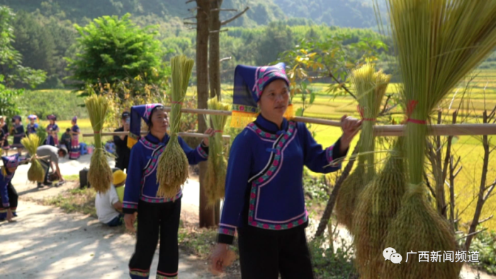 德保县足荣镇龙写村的农民朋友们,在广西区级非物质文化遗产隘章土布衬托下,以青山绿水为背景,以广阔天地为舞台,舂糍粑、包粽子、对山歌,用传统农技、山歌表演等丰富多彩的活动,讴歌时代发展,赞颂劳动甘甜。除了舂打糍粑外,农民朋友们还包了99斤的大粽王庆祝丰收,表达丰收的喜悦。