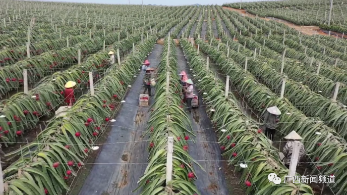 连日来,隆安县又一批火龙果进入采摘期,当地果农穿梭于果园中采摘果实,现场一片红红火火的丰收景象。