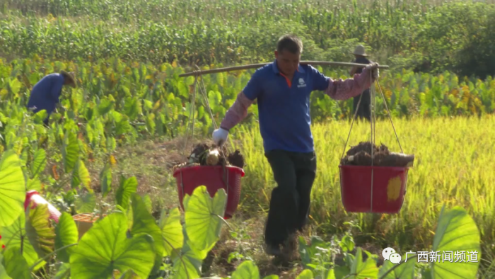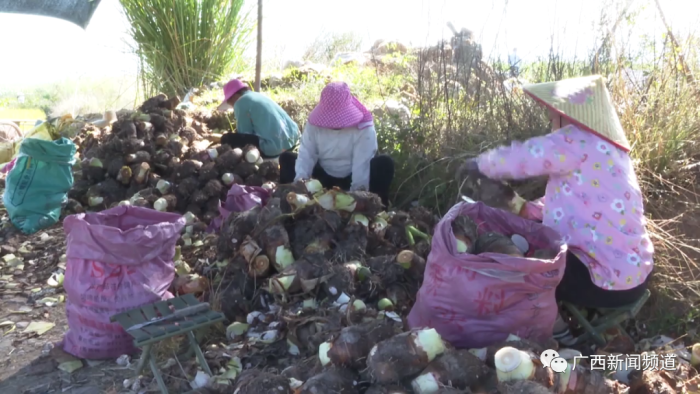 近日,金秀瑶族自治县桐木镇鹿鸣村的田间地头一派热闹的丰收景象,村民们正忙着采收成熟的槟榔芋,并将芋头打包、分装,售往外地。