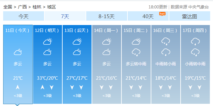 11月12-13日,桂林维持多云间晴,桂林市区最高气温仍有33℃左右。从这一天起,“唱主角”的南风将被北风所替代,风力可能达到3-4级。