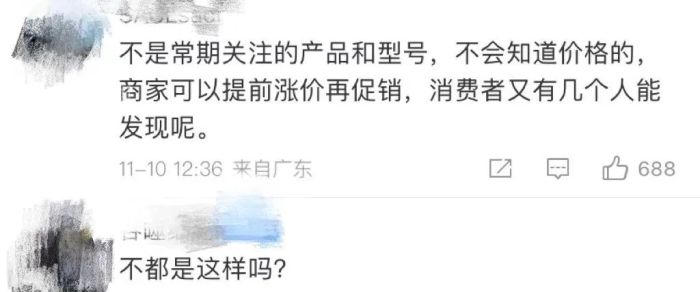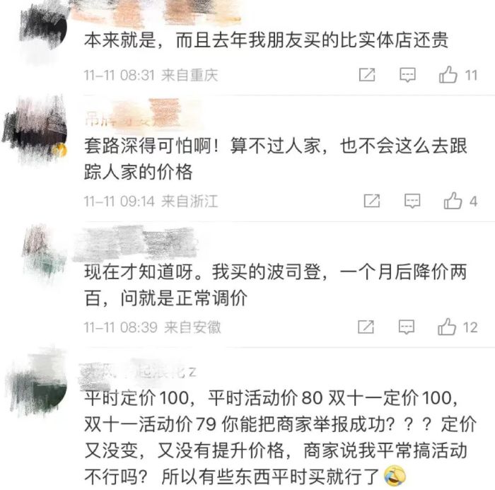 另外,在去年“双十一”期间,国家市场监管总局就曾下发《关于规范“双十一”网络促销经营活动的工作提示》指出,禁止采取“先提价后打折”、虚构原价、不履行价格承诺等违法方式开展促销,杜绝虚假宣传,妥善化解网络消费纠纷。