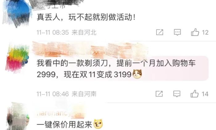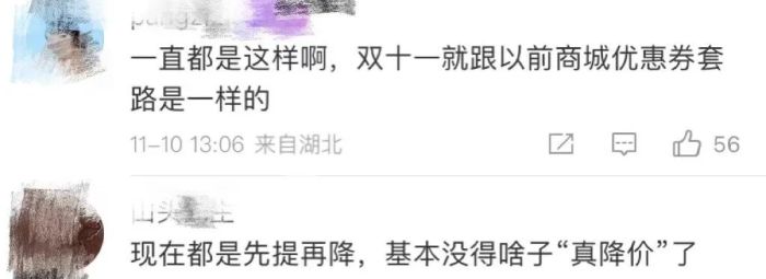 据网友反馈来看,“双十一”期间有不少类似情况的商家,由于活动各种领券补贴的活动让人眼花缭乱,很多套路会让消费者花更多的钱。