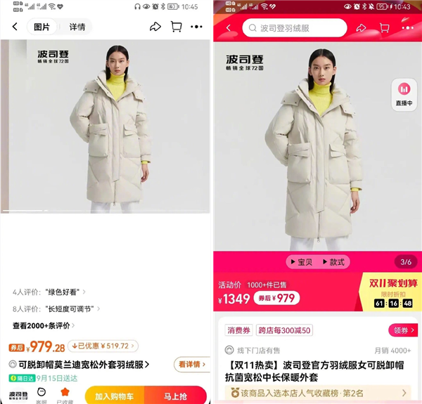 上海市民李女士爆料,“双十一”预售期间,她原计划在淘宝波司登旗舰店购买一件可脱卸帽莫兰迪宽松外套羽绒服,这件外套在9月份时,平台的价格是券后979.28元。没想到在“双十一”预售期间,该款羽绒服的价格提升至1349元,领券购买后实际价格仍为979元,让她实在无法理解。