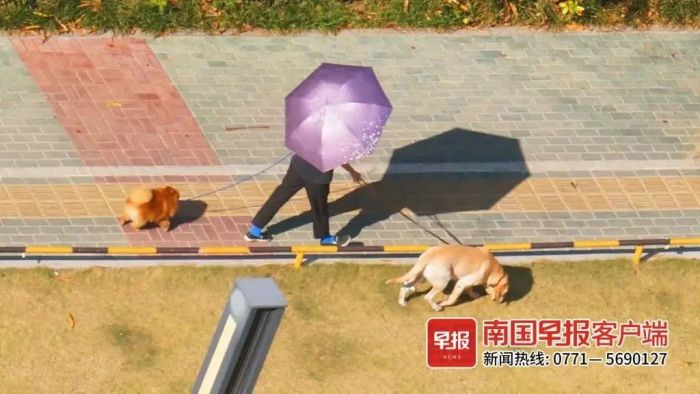 ▲11月12日,南宁一市民在户外阳光下遛狗。南国早报记者 何定坚摄