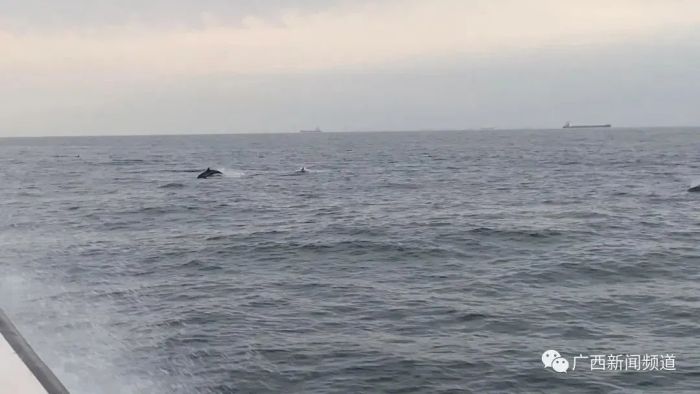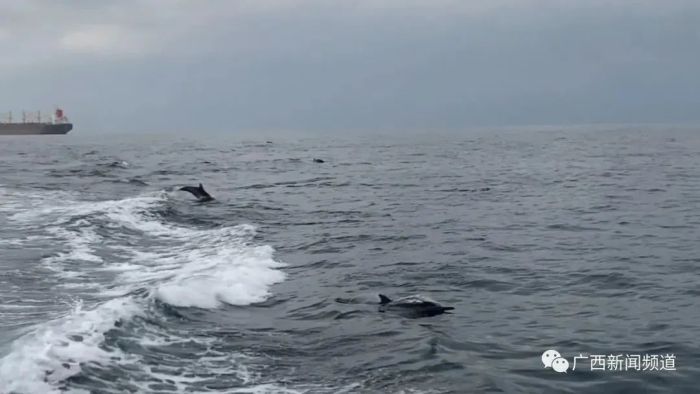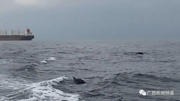 广西科学院北部湾海洋研究中心副研究员 陈默:基本上看了是真海豚,长喙真海豚。每年到11月这几天我们在北部湾都能看到,具体是为什么进来或者为什么这个季节出现我们还不是很清楚。