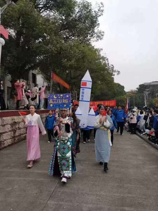 伴着激昂的旋律和主持人激情洋溢的解说,整齐有序、口号嘹亮的55个班级方阵依次经过主席台,接受领导检阅。他们坚定的步伐、飒爽的英姿,展现出青春少年活力四射的青春风采。各班级方阵队,更是“班班出奇招,班班有花样”,服装整齐划一,包括儒雅大气的汉服、精致的民国服饰等,宛如一场盛世中华的服装秀;展示形式丰富多样,包括诗歌朗诵、班级个性舞蹈等,让人目不暇接、赞不绝口;“爱我中华!”、“志存高远,无悔高三!”、“用激情点燃高考,用拼搏换取成功!”……各班的铮铮誓言响彻校园上空,鼓舞人心,激发昂扬斗志。尤其更为精彩的是舞狮表演,狮身动作矫健跃进,一招一式刚劲有力,赢得现场师生们的热烈掌声和激情的欢呼声!