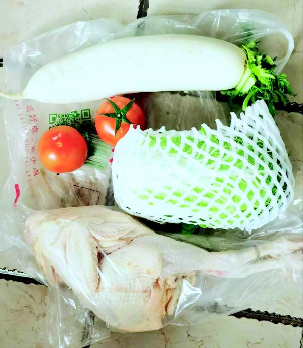 第一次收到了一只鸡、一个萝卜、一个洋葱、四个土豆和一个苹果。第二次收到的物资也差不多,还有一颗大白菜。第二天,邻居们就在朋友圈里晒起了用这些物资做的美食。有邻居还在朋友圈里调侃说:“小区里‘萦绕’着砍鸡的声音,整个小区都飘散着鸡汤的味道”。