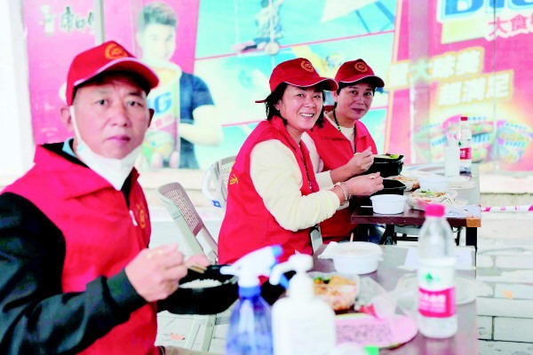 市区一核酸检测点结束早上的检测后,志愿者们在简陋的临时雨棚里休息,吃盒饭。记者苏展 摄