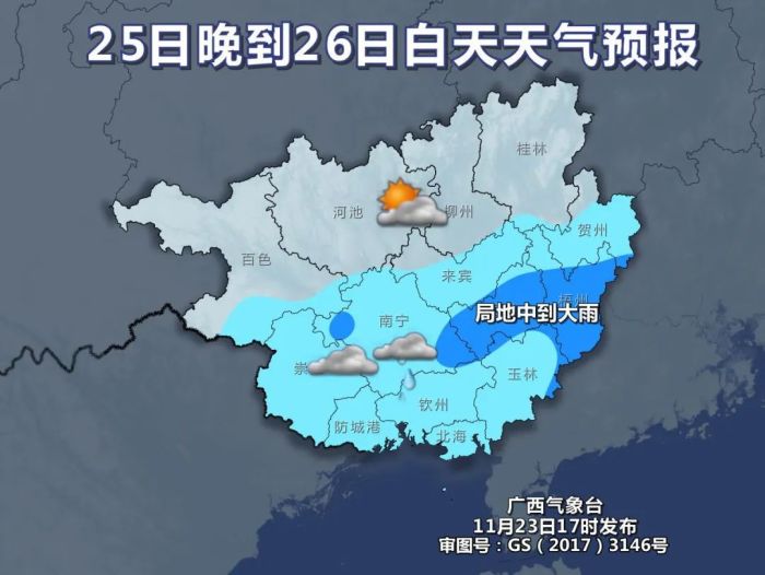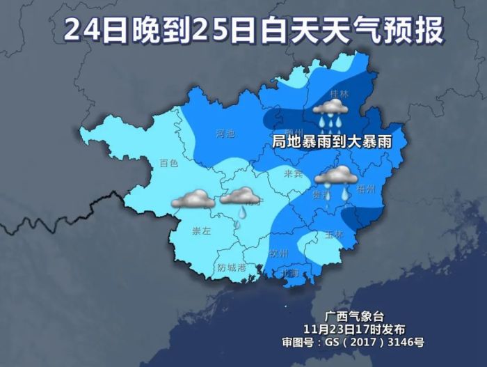 24日晚上到25日白天桂北、桂东部分地区有中到大雨、局地暴雨到大暴雨,我区其它地区阴天大部有小到中雨