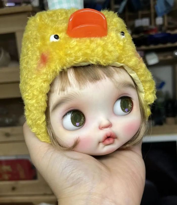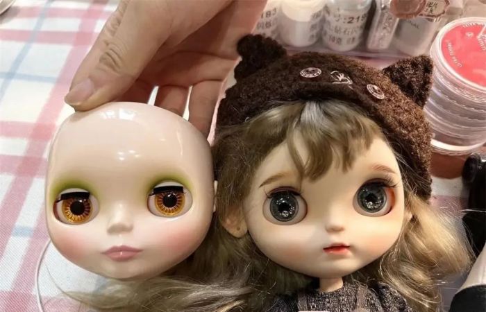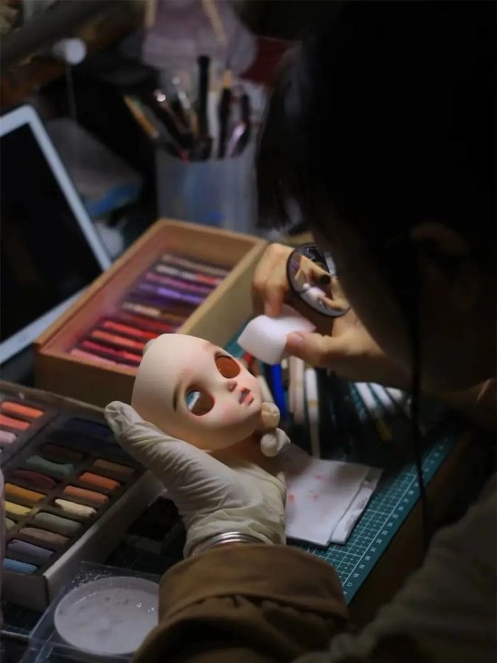 改娃看似简单,但过程细碎而繁琐。需先将亮面素头磨成雾面,然后雕刻、打磨调整面部结构,有时为突出脸部肉感,还得补土。雕鼻子、开嘴巴、刻唇纹是关键,最后还要用砂纸打磨,让面部平滑方便后续上妆。上妆也很考验手艺,层次丰富的眉毛、根根分明的睫毛,还有腮红、红唇,甚至是小雀斑,都是从无到有画出来的。