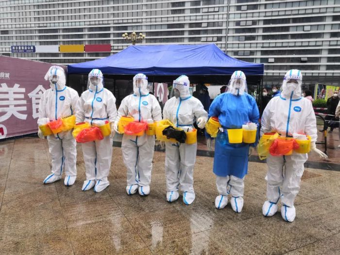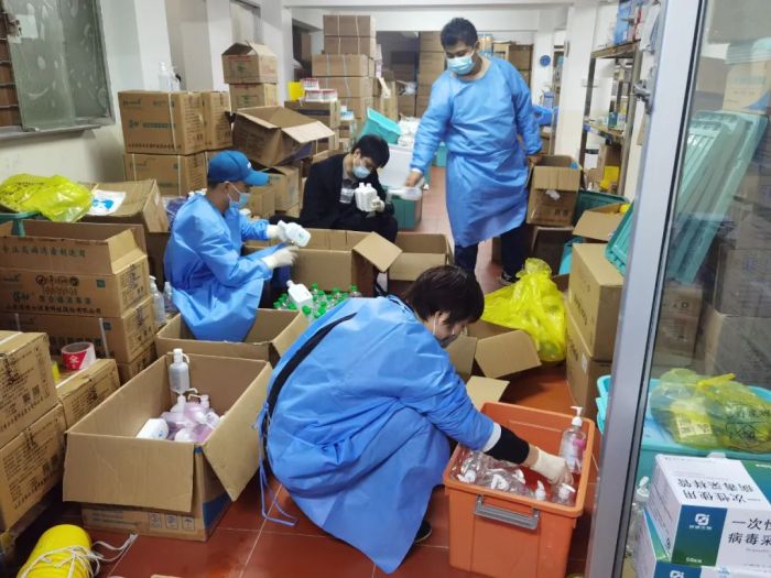 郑丽燕(左一)跟同事们在忙碌的筹备物资