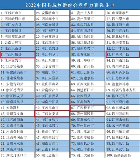 《报告》显示,2022中国旅游百强县市分布在19个省(自治区、直辖市)。其中,广西的阳朔县、兴安县、桂平市、灵川县位列其中。