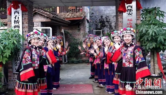 都安瑶族自治县民众在“瑶山妹”文化创意园门前迎宾客。高东风 摄