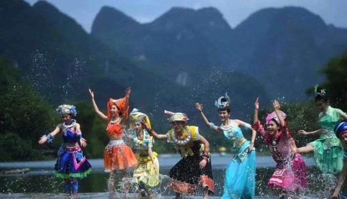 图为青年男女们身着华丽的民族服饰在漓江戏水。 陈超 摄