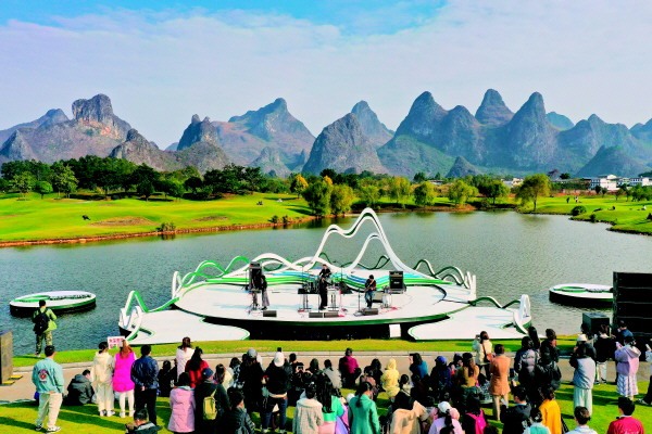 文/摄)12月10日下午,在桂林桂海晴岚的水上舞台,首场山水LIVE·桂海晴岚摇滚音乐派对在美丽的山水间激情上演。在山间,在湖畔,在绿草地上,观众们尽情享受这一颇具诗意和激情的音乐盛宴。
