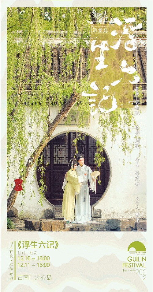 昆曲《浮生六记》厅堂版又名“布衣菜饭版”,题意取自《浮生六记·闺房记乐》中芸娘所说“布衣菜饭,可乐终身,不必作远游计也”。以回忆的方式,截取沈复和芸娘从沧浪亭搬至仓米巷的时间线,通过他们搬家、买菜、做饭、更衣的日常生活,展现平凡夫妻细水长流、苦日子甜过的“小确幸”。值得一提的是,此次在桂林艺术节上演的昆曲《浮生六记》厅堂版结合古南门湖心岛环境,进行全新的编排演绎,通过沉浸式场景转换给桂林观众带来诗意的苏式生活体验。“本次最大的不同,在于看到不同的背景转换,实景风光化成了舞美与演员融为一体。同时我们为湖心岛定制了一条沉浸式路线,希望观众可以沉浸其中,体验生活的两人三餐四季。”导演胡翰驰说。
