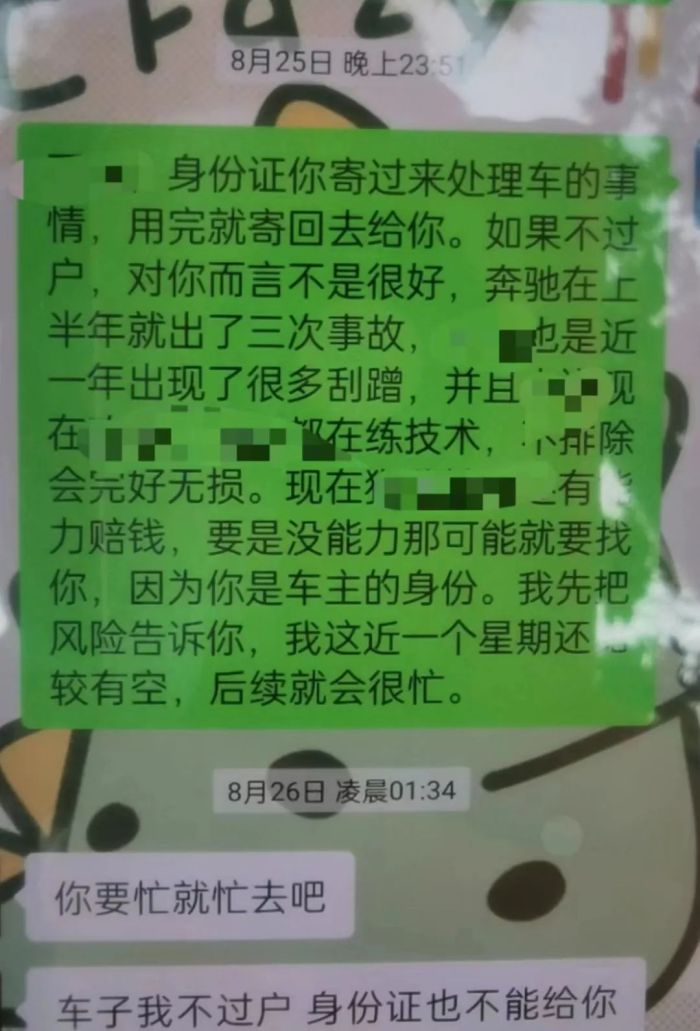 8月25日晚上,毛女士再次尝试联系何某某。8月26日凌晨,何某某回复她称:“你要忙就忙去吧,车子我不过户,身份证也不能给你。”