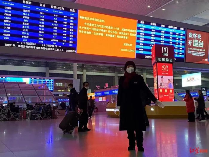毫无疑问,这种不分级别、不分亲疏的送别方式,透着平等、友爱的企业文化内涵,令人感动。对一个用岁月书写工作历史的人来说,“单位”“车站”“大屏”这些关键词有着特别的含义。几年前,长铁公安处老铁警姜向和最后一班岗深吻列车告别的视频,同样感动了万千网友。人们从这类镜头中“看”到了单位对于个人的温暖,也“看”到了一个人对于单位的深情。在很多人的生涯里,单位是除了家庭之外,最大的一处立身之地。而一个以服务为“主业”的单位,更是个人工作自觉和奉献情怀叠加的地方。成都东站的发展史,不仅是一部铁路客运发展史的组成部分,也见证了无数铁路客运人质朴无华的服务奉献。检票在火车站的工作体系中,算是一个平凡无奇的工种。这项工作所累积的庞大数据,非亲历者不能感触。在平凡之中,建立起不平凡的业绩,就源于这种日复一日的劳动。这种辛劳并不是轰轰烈烈的,而是充满着细微、扎实的意味。可以说,在“铁路客运”这个宏大的叙事中,“检票”必然地成为精准无误的代名词。而在迈入高铁时代之后,尽管数字化技术普及,但我们依然可以从检票员的“在场”中发现他们的工作价值。
