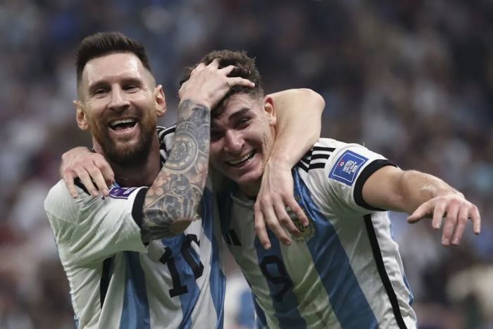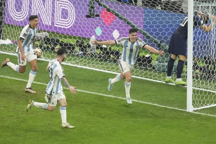 22岁的阿尔瓦雷斯当天独中两元表现抢眼,个人在本届赛事已有4球入账,在接到梅西的助攻破门之前,他不仅创造了阿根廷队打破僵局的点球,还单骑闯关打入一粒进球。