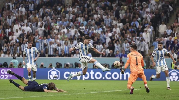 阿根廷队第39分钟发动反击,阿尔瓦雷斯从本方半场得球后带球突入对方禁区,虽然克罗地亚队球员在禁区内阻断了他的带球,但皮球又弹回他的脚下,阿尔瓦雷斯随即将比分扩大为2:0。上半场伤停补时,克罗地亚队有机会扳回一球,尤拉诺维奇的传中打在防守球员身上弹向球门,阿根廷队门将马丁内斯飞身化解险情。