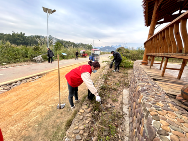 组织三联村与派驻单位联合举办“贯彻二十大·服务我先行”主题党日活动。学习借鉴优秀党组织经验,组织驻村支部与三联村党总支结对共建,联合开展主题党日活动,体现了荔浦市审计局对第一书记工作的高度重视、强力支持,坚定了“抓党建 促乡村振兴”信念。把元旦庆祝活动与人居环境提升相结合,组织全体党员开展义务劳动,到湿地公园捡垃圾、整治路旁荒片、捡石填坑,为三联村营造了一个“通透明亮”优美环境。