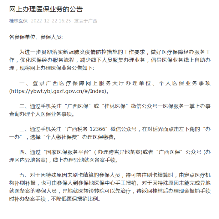 12月22日,桂林市医疗保障局在其官方微信公众号发布重要提醒。公告中表示,为进一步贯彻落实新冠肺炎疫情防控措施的工作要求,做好医疗保障经办服务工作,优化医保经办服务流程,减少线下人员聚集办理业务,该局开始倡导医保业务线上自助办理。同时,该局还在通知中就网上办理医保业务的有关方式进行了公布。